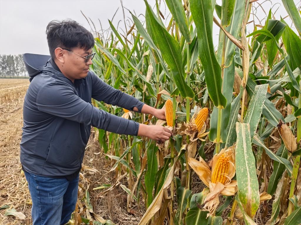 2025年10月10日,安徽省宿州市萧县金旺家庭农场担任人许大宾查看待收割的玉米质量。新华社记者 水金辰 摄