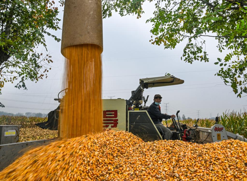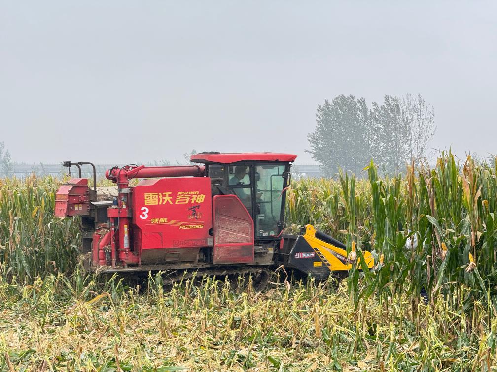 “轰隆隆……”在河北省邯郸市广平县平固店镇大庙村乡民赵国英的玉米田里,3台来自河南驻马店的履带式收割机正在田间来回络绎,全力协助农户进行秋收收尾。