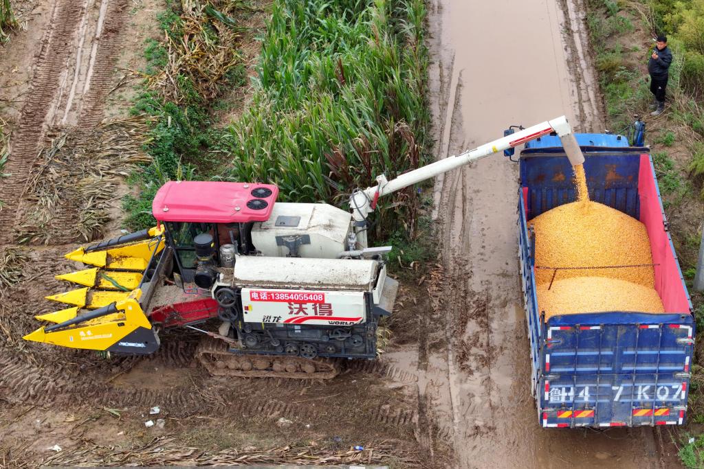 2025年10月11日,在安徽省淮北市濉溪县百善镇张庄村,从河南驻马店调运过来的履带式收割机在收割玉米。新华社发(徐宏扬 摄)